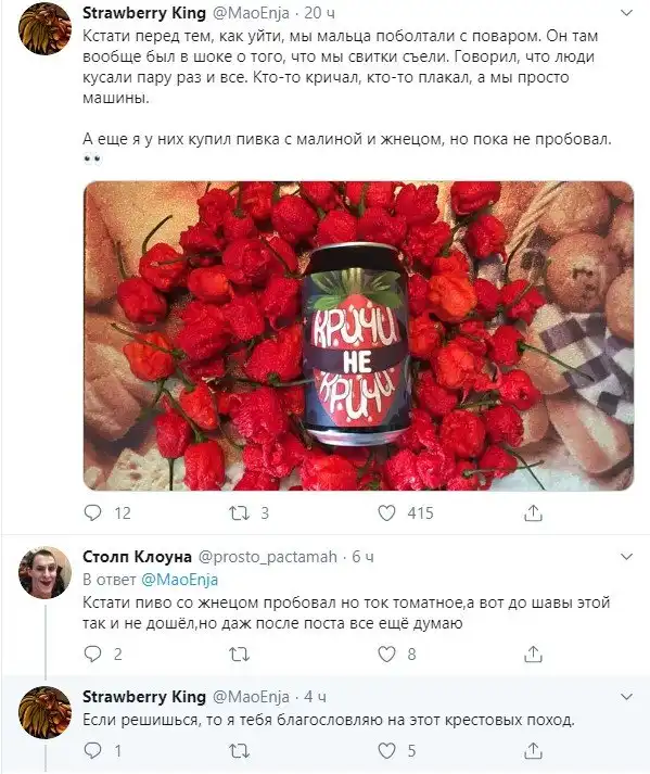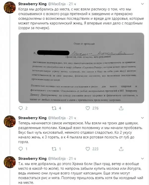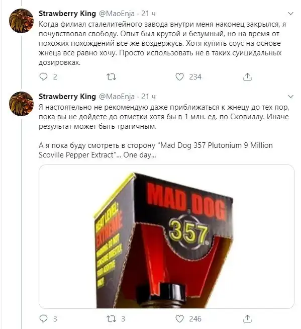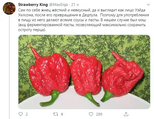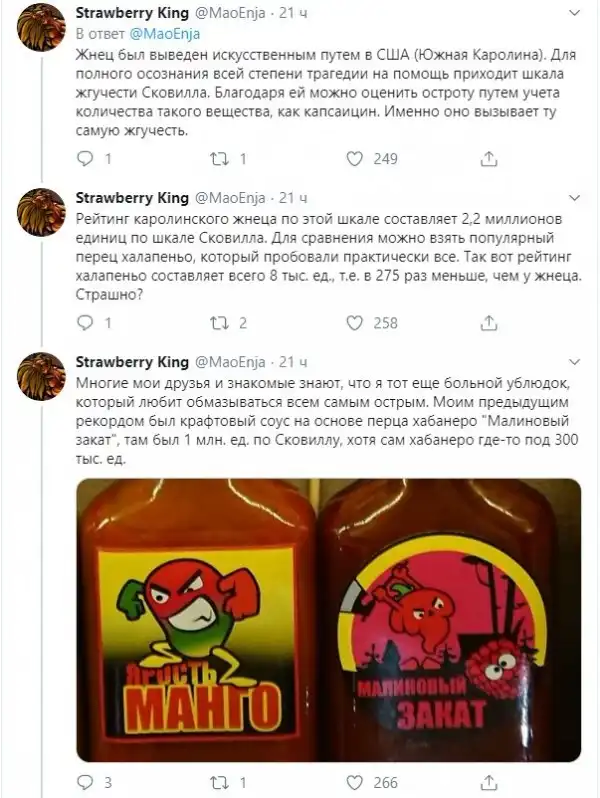 Рассказ о том, что случается с человеком, который решил рискнуть съесть Каролинского жнеца (Carolina Reaper), занесенного в книгу рекордов Гиннесса как самый острый перец в мире. И о том, почему на самом деле не стоит этого делать.