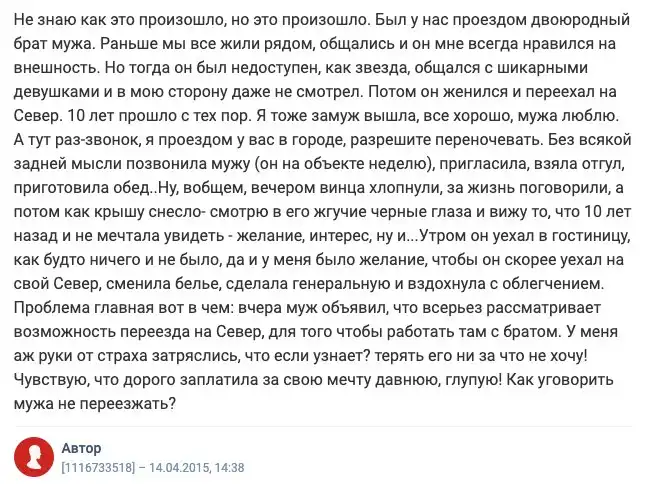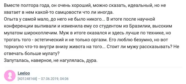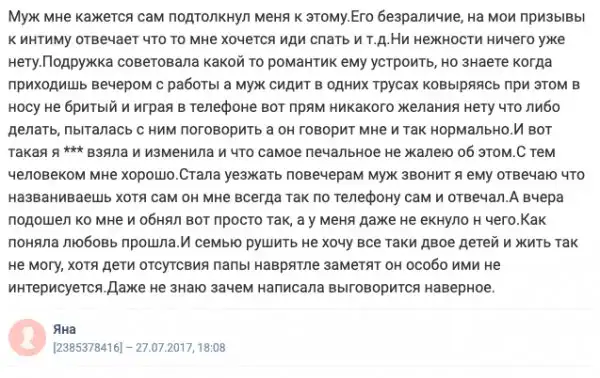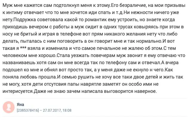 На известном женском форуме каждый день выходят обсуждения на различные темы. Часто женщины и мужчины пишут о личном, о том, что их волнует, потому что анонимность форума позволяет раскрыть душу. Сегодня мы хотим затронуть щепетильную тему измен. Что делать, если это случилось? Скрывать или признаться? Как сохранить брак после? Давайте разбираться вместе, что же служит поводом для измен.