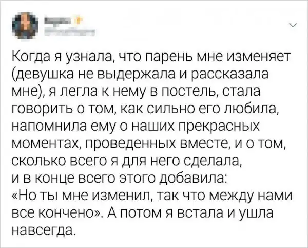 Расставание - это всегда неприятно и печально. Но люди реагируют на событие по-разному: кто-то грустит и таит обиду, другие со смехом вспоминают былые времена, а есть и те, кто делает выводы и придает их огласке. Так и сделали авторы этих твитов. Они поведали о забавных, а иногда печальных случаях, которые приключались с ними после разрыва отношений.