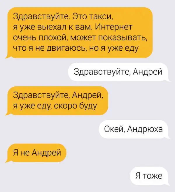 Сегодня многие люди заказывают такси через приложение в телефоне.Такой способ действительно гораздо удобнее. Можно быстро найти машину, узнать, на каком автомобиле вам предстоит поездка, а также можно отследить перемещение водителя. Ну и конечно же в приложении у нас есть возможность напрямую связаться с водителем. И порой общение с таксистом получается очень странным и смешным. Давайте посмотрим.