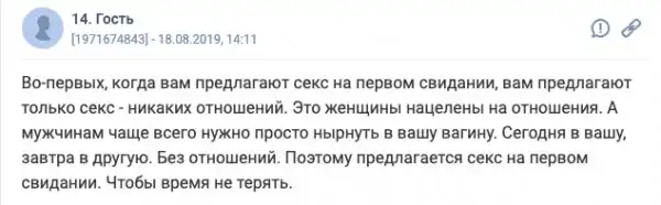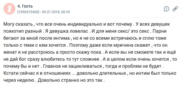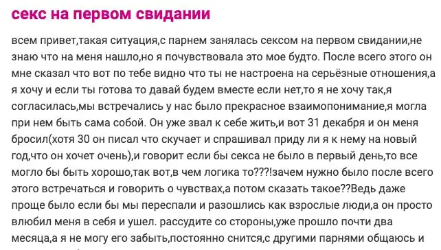 А что он обо мне подумает? А позовет ли на второе свидание? Именно такие вопросы обычно беспокоят женщин. Некоторые оттягивают момент близости до 3 свидания, другие - готовы воздерживаться в течение месяца. Все индивидуально, но мы решили подсмотреть мнения девушек.