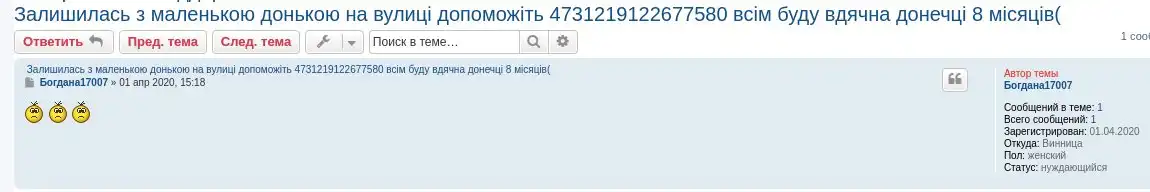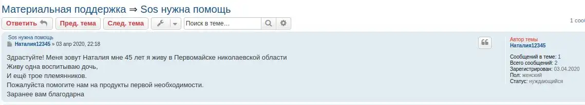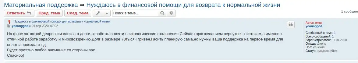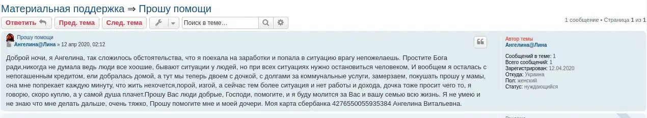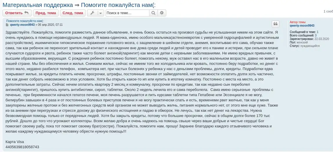Сложно проверить правдивость написанного - это вполне могут быть мошенники, желающие поднять лёгких денег. Хотя вполне могут быть и реальные случаи. Вы готовы просить помощи, если не останется других вариантов?