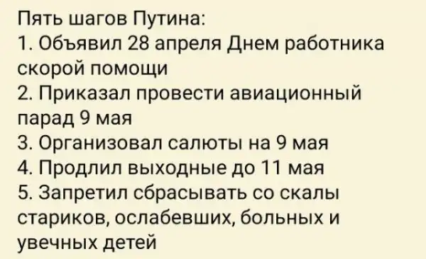 Судя по всему, российский президент Владимир Путин где-то откопал несколько учебников истории, поскольку в каждом его обращении есть ссылки на темы, которые вообще никак не относятся ни к пандемии коронавируса, ни к ограничительным мерам, введенным во многих городах. Раньше были печенеги и половцы, а теперь Спарта - и ни слова о том, что его "нерабочие дни с сохранением заработной платы" практически не работают. Многие до сих пор остаются без работы и денег, а некоторым матерям приходится выходить и просить милостыню.