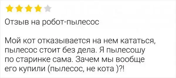 Благодаря отзывам мы можем узнать реальное мнение людей о том или ином товаре в интернет-магазине. Поэтому почитать их никогда не будет лишним. К тому же среди отзывов можно найти настоящие шедевры комедии. Давайте посмотрим.