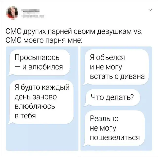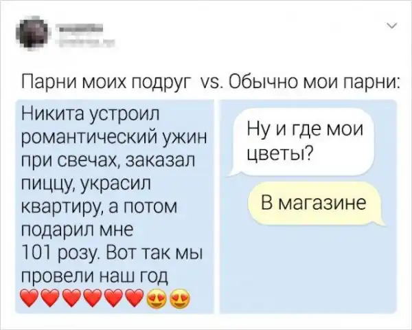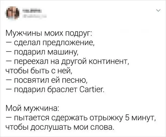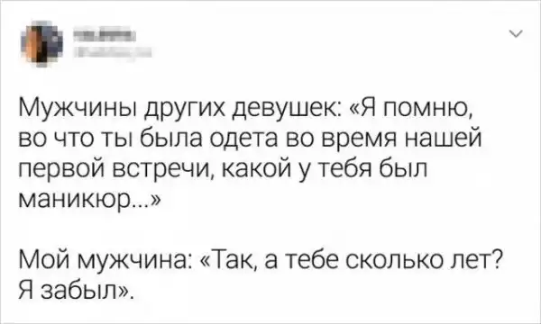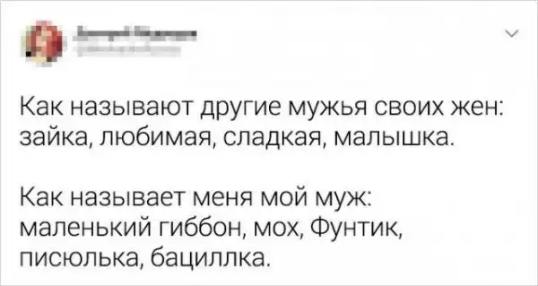 Как девушкам, так и мужчинам, порой хочется пожаловаться на своих вторых половинок. Например, девушки особенно нервничают, когда начинают сравнивать свои отношения с чужими. Например, смотрят чужой Instagram, в котором публикуются отшлифованные фотографии чей-то семейной идиллии. Но завидовать плохо и авторы данных твитов это понимают. Мало ли что скрывается за идеально картинкой. Поэтому девушки относятся к своим неурядицам в отношениях с юмором. Они иронично рассказали о своих парнях, сравнивая их другими мужчинами.