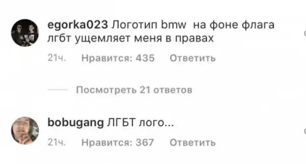 «В BMW мы живем многообразием. Мы верим в открытую культуру, в которой нет места привилегированности или дискриминации по происхождению, цвету кожи, национальности, полу, религии, инвалидности или возрасту», — говорится в публикации. Отметим, это решение компания приняла в честь Месяца прав геев и лесбиянок (Gay and Lesbian Pride Month), который ежегодно отмечается в США в июне. А вот что думают по этому поводу русские.