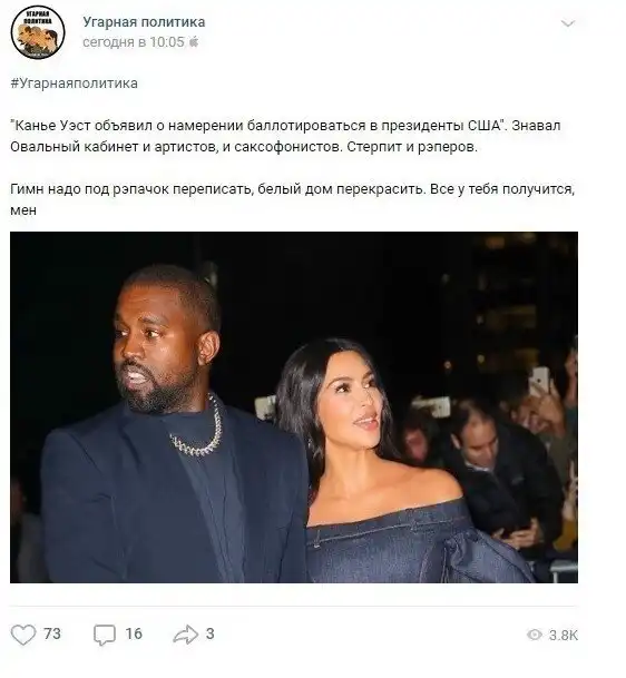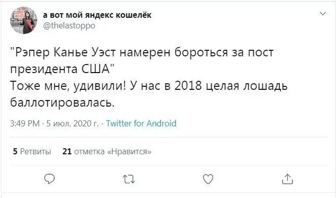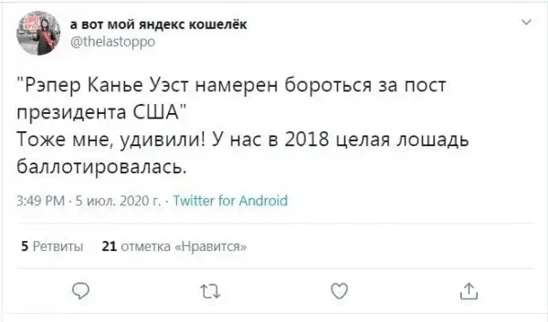 Известный на весь мир рэпер Канье Уэст объявил о намерении баллотироваться на пост президента-2020. Темнокожего музыканта уже поддержал в твиттере другой народный любимец — предприниматель-ракетчик Илон Маск. Ну, по традиции, интернет эта новость знатно потрепала.