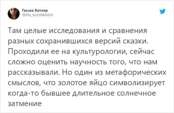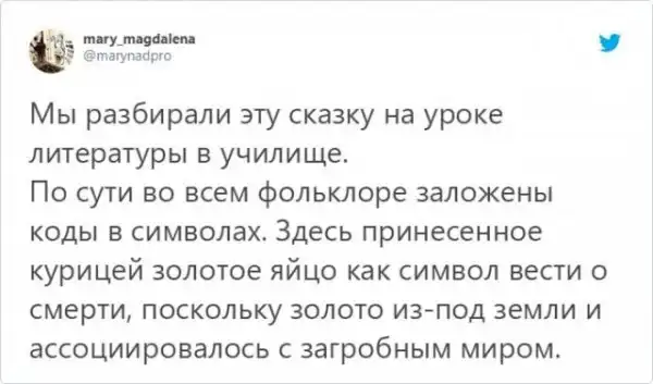 Русские сказки - кладезь идей и наставлений, которые затем пригодятся в жизни. Все ли из нас помнят "Курочку Рябу" и ее тайный смысл? А вот пользователи решили порассуждать, в чем логика и... узнали немало интересного.