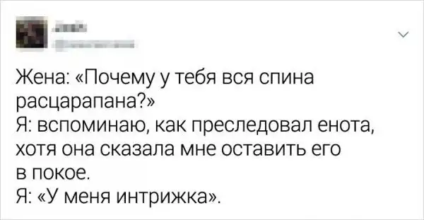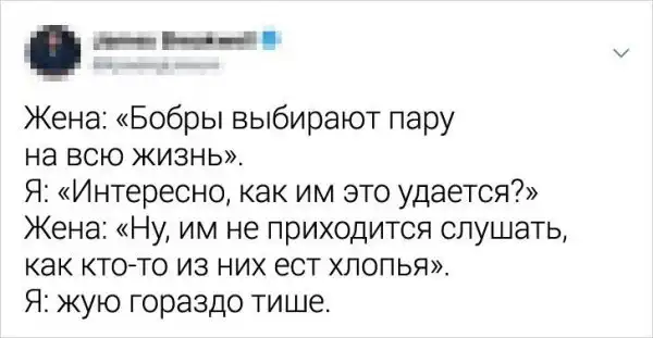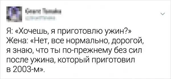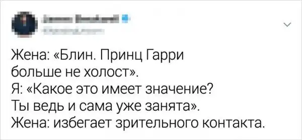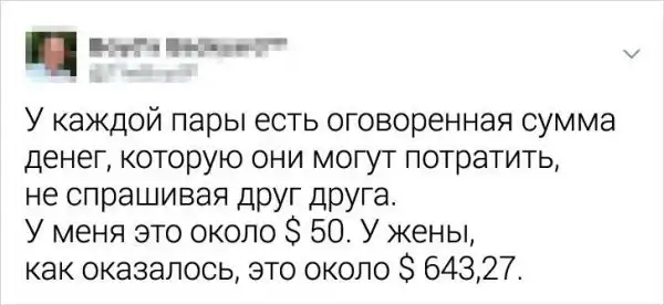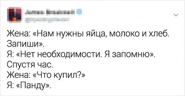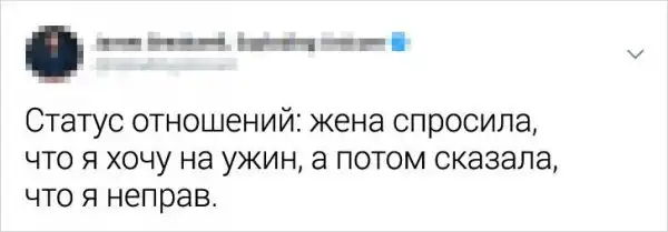 Период медового месяца и семейной благодати обычно длится недолго. На смену радости приходит зловещий "быт". Поэтому молодой семейной паре нужно пройти экзамен на прочность. А чтобы успешно пройти этот тест, нельзя забывать о чувстве юмора, который поддержит в трудный час. Давайте посмотрим забавные твиты о семейной жизни.