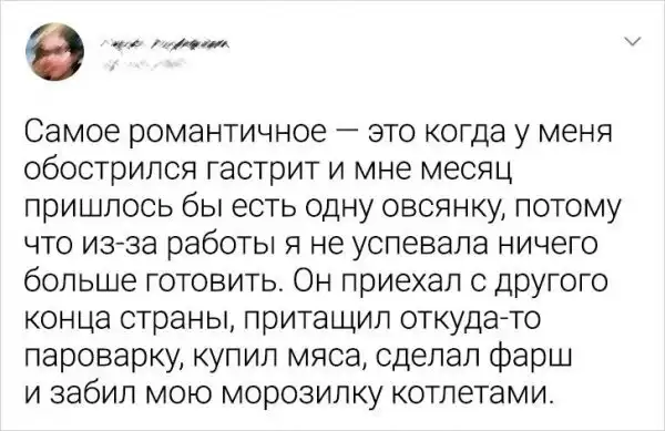 Что такое любовь? Весьма глубокий вопрос, но у каждого человека свое понимание и проявление любви. Любовь - это не только сдувание пылинок друг с друга, конфеты, цветы и подарки. Порой совместное приготовление котлет значит куда больше, чем все вышеперечисленное. Давайте посмотрим подборку забавных, трогательных и романтических твитов о самом прекрасном чувстве на планете.