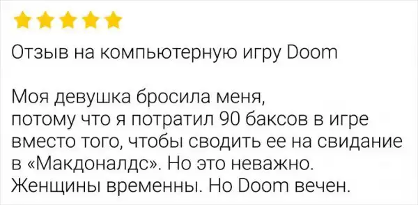 Порой люди пишут такие искрометные отзывы в интернет-магазинах, что сразу же возникает желание купить тот или иной товар. В этих отзывах есть все: интригующая завязка, драматичное развитие и, конечно же, юмор. Давайте посмотрим.