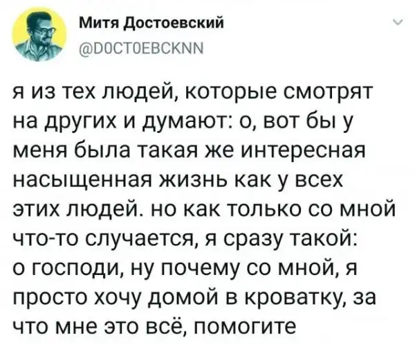 Не дает покоя какая-нибудь мысль? Не стоит с ней расставаться понапрасну. Ее всегда можно написать в Твиттер и найти признание единомышленников. Авторы этих забавных твитов никогда не упускают возможность пошутить и подметить какой-нибудь необычный факт, который не дает им спокойно жить. Давайте посмотрим, о чем они поведали на этот раз.