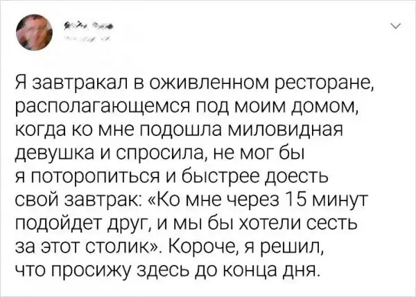 Каждый день мы сталкиваемся с массой раздражающих мелочей. И если сдерживать в себе негатив, то однажды может случиться нервный срыв. Поэтому нужно искать варианты для эмоционального отдыха и разгрузки. Можно поколотить грушу, выпить пару стаканов виски или начать медитировать. Но есть еще один интересный вариант. Выскажитесь по полной программе в Твиттере, как авторы этих мини-историй. Давайте посмотрим.