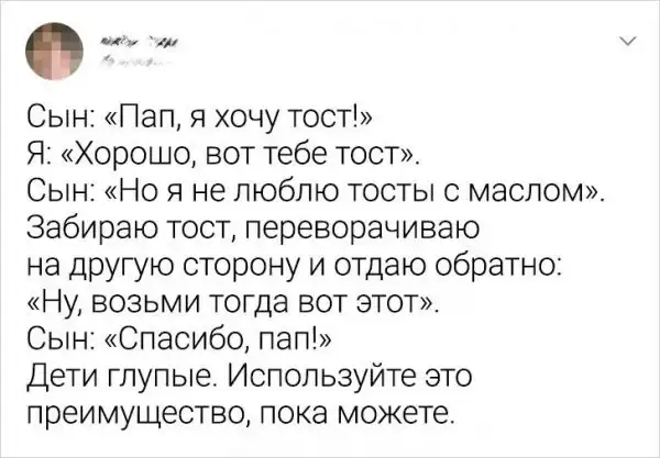 Вспомогательная литература о воспитании малышей - штука полезная, но настоящее родительское мастерство приходит только благодаря методу проб и ошибок. Мамы и папы должны всячески хитрить, чтобы наставлять детишек на верную дорогу. Давайте посмотрим подборку забавных твитов о воспитании чад, авторы которых постигли мастерство воспитательного искусства.