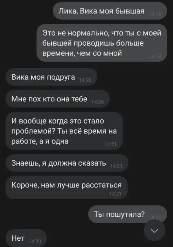 ей хочется бл*довать, скандалить, бухать, а с ним это не получится. ну и бывшая напела этой дуре, что им нужно расстаться. чувак два раз подряд наступил в одну кучу дерьма
