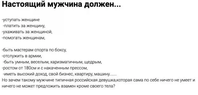 В социальных сетях часто начинают обсуждать тему взаимоотношений между мужчинами и женщинами. Свои требования, без сомнения, есть у каждого человека. Однако многие девушки открыто заявляют о том, что мужчина им что-то "должен". Какую сторону занять - каждый решает для себя сам. Что вы скажете по этому поводу?