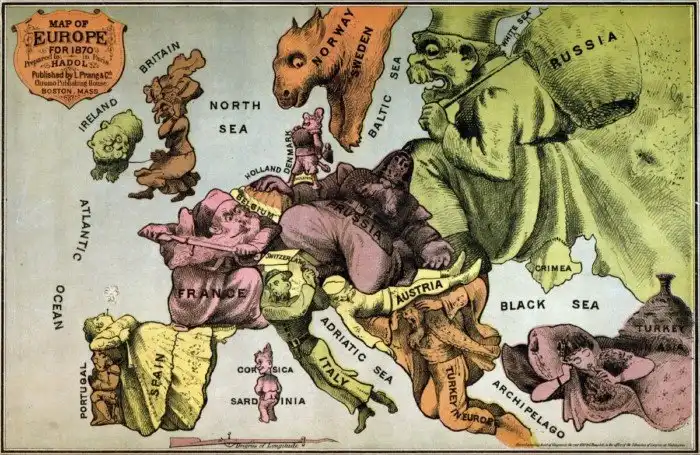 Корсика и Сардиния - маленькие шуты, которые смеются над гигантами. Италия просит Бисмарка убрать ногу. Дания в сражениях потеряла ноги, но гордо надеется их вернуть.