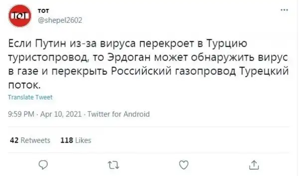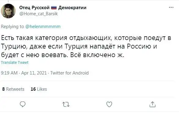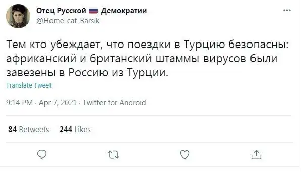 Как пишут многочисленные СМИ, власти России могут ввести ограничения на авиасообщение с Турцией с 12 апреля на месяц из-за вспышки ковида. Пользователи соцсетей усомнились, что причиной является инфекция, поэтому в штыки встретили эту новость.