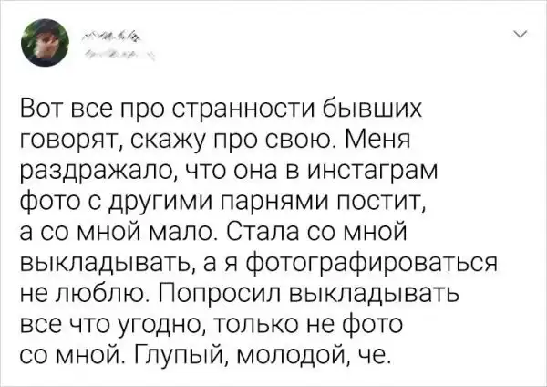 Пожалуй, все согласятся с тем, что у всех людей есть свои тараканы в голове. У кого-то их много, а других один таракан... но очень большой (например, мадагаскарский).Пользователи Твиттера решили объединится в общем треде и поведать о странных причудах своих бывших.