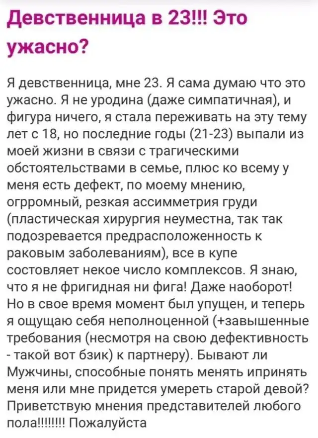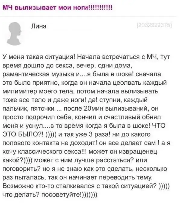 А вот и новые безумные истории с женских форумов, в которых дамы делятся самым сокровенным и задают крайне странные вопросы, как правило, касающееся личной жизни. Понять все это невозможно, остается только принять, понять... и простить.