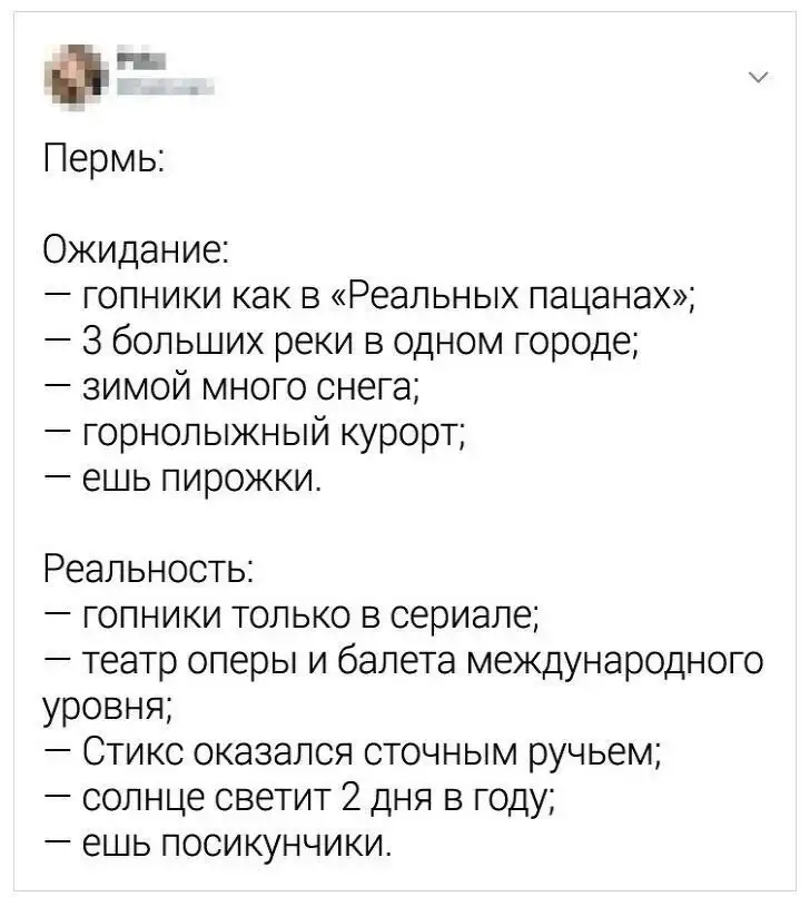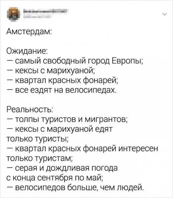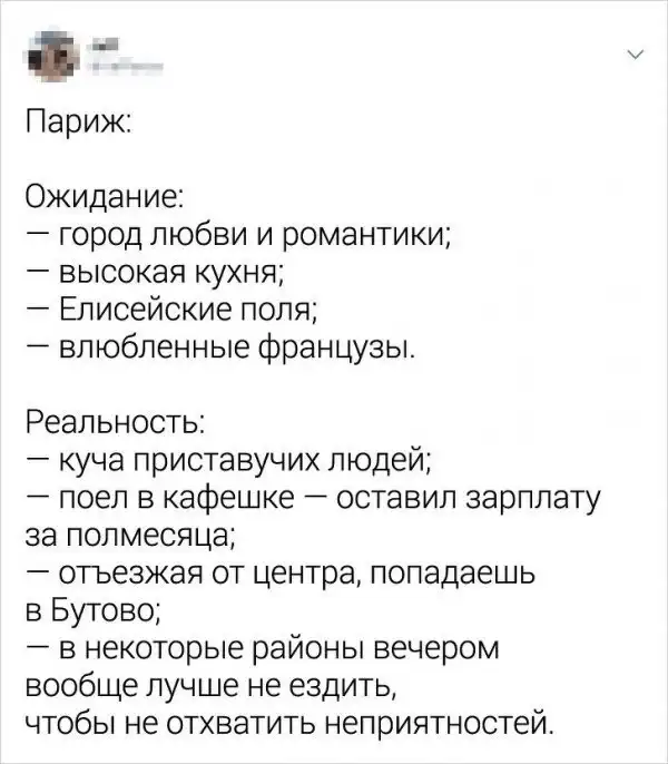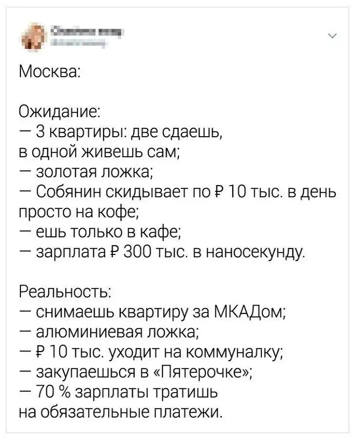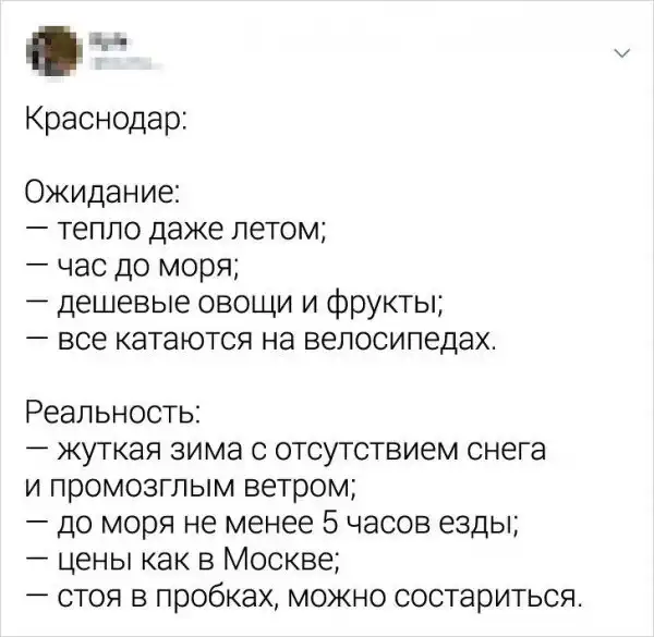 В Твиттере рассказали о жизни в самых разных городах в формате "Ожидание VS Рeaльнocть". Конечно, тред стоит воспринимать с юмором, однако доля истины в постах пользователей все-таки есть.