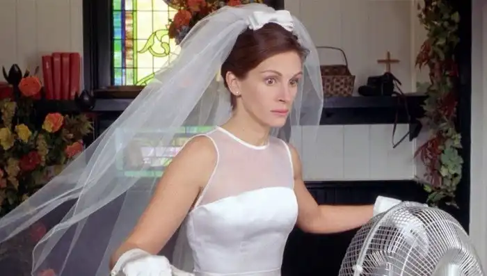 "Невеста опаздывает на собственную свадьбу почти на два часа. Южная Калифорния: чистое поле, ни капли воды, некуда укрыться от солнца. Невеста появляется и заявляет, что хочет выйти замуж в спортивном костюме, в котором она занималась йогой. Жених был против этого; когда же она отказалась переодеться, он решил уехать, оставив её в дурацком положении. Так они и не поженились."