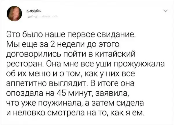 Провальные свидания - это тема для шуток, которая будет актуальна во все времена. Эти фейлы на любовном фронте случаются сплошь и рядом, но это не повод печалиться или злиться. Любую неудачу можно переформатировать в юмор. Собственно, так и поступили авторы этих твитов.