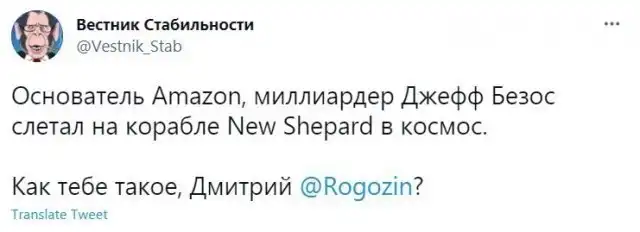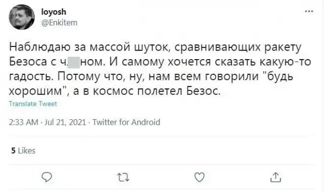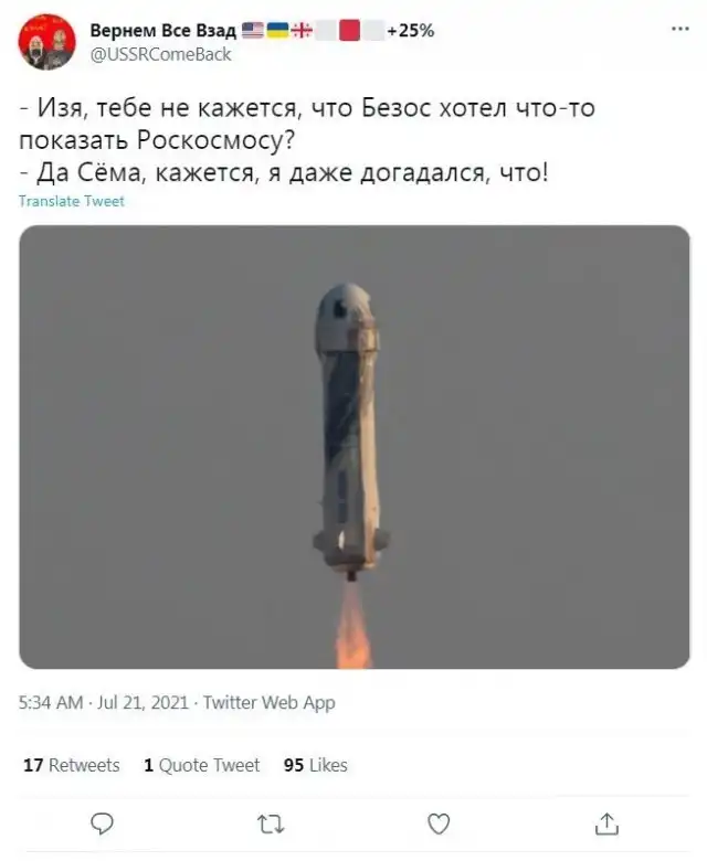 Ранее сообщалось о том, что миллиардер Джефф Безос, в компании еще нескольких людей, вышел на корабле New Shepard в космос. И эта новость не укрылась, само собой, от глаз россиян. Кто-то сказал, что ничего особенного в этом нет, поскольку стоит покорять дальний космос, а кто-то наоборот оценил старания предпринимателя. А некоторые и вовсе начали сравнить внешний вид корабля с "чем-то очень известным".