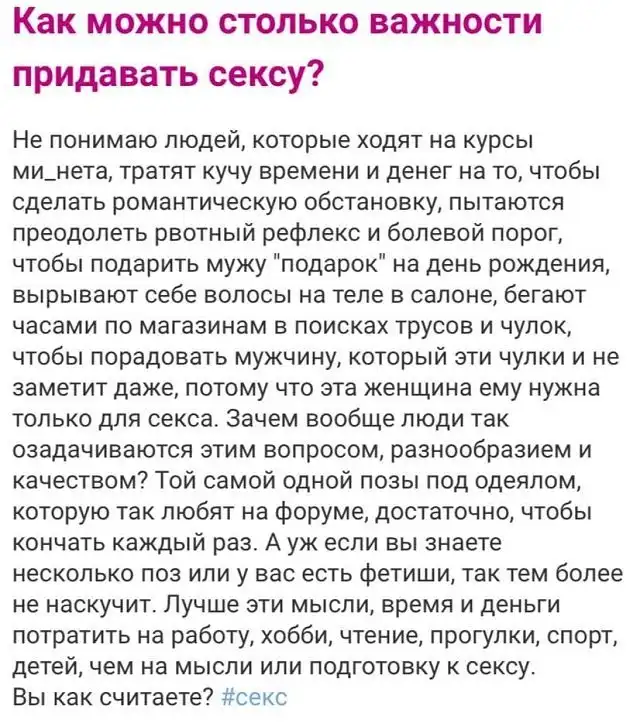 Ох, ну и срамота... и как это все умещается в их голове? Благо для таких безумных мыслей и вопросов существует специальное место - женские форумы. Там барышни делятся совершенно безумными историями и интимными проблемами из их личной жизни. Читаешь и думаешь: "Как же скучно я живу".