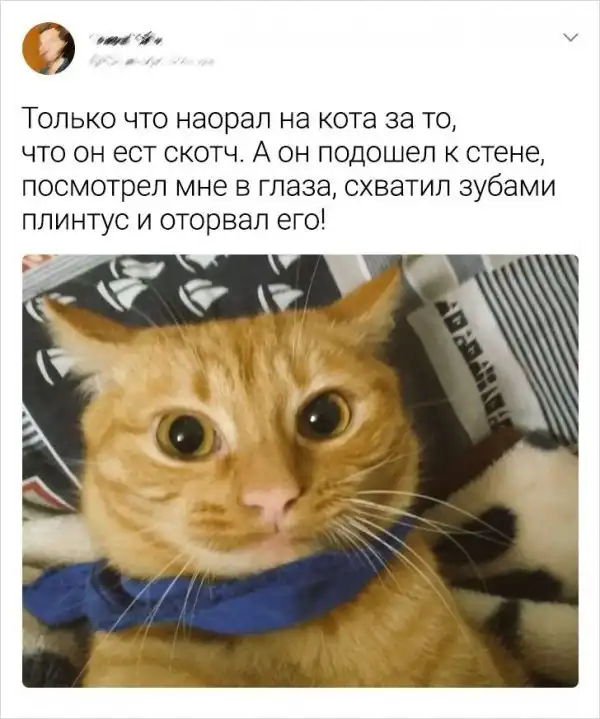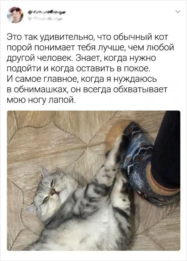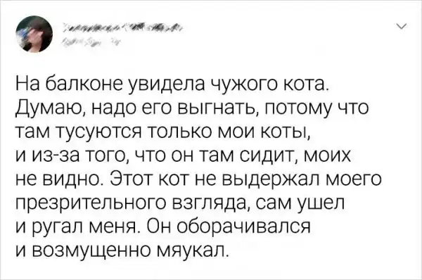 Есть люди, которые не под каким предлогом не согласятся сожительствовать с котом. Ведь все будет в шерсти, мебель испорчена, а все углы "помечены". Но... все-таки не зря говорят, что "без кота - и жизнь не та". Да, с котиками порой бывает трудно, но с ними никогда не соскучишься. Давайте посмотрим подборку забавных твитов, которые особенно понравятся владельцам котов.