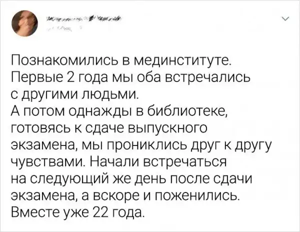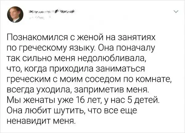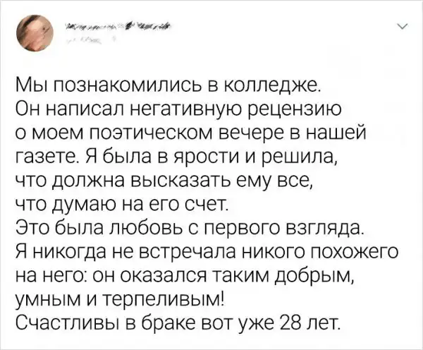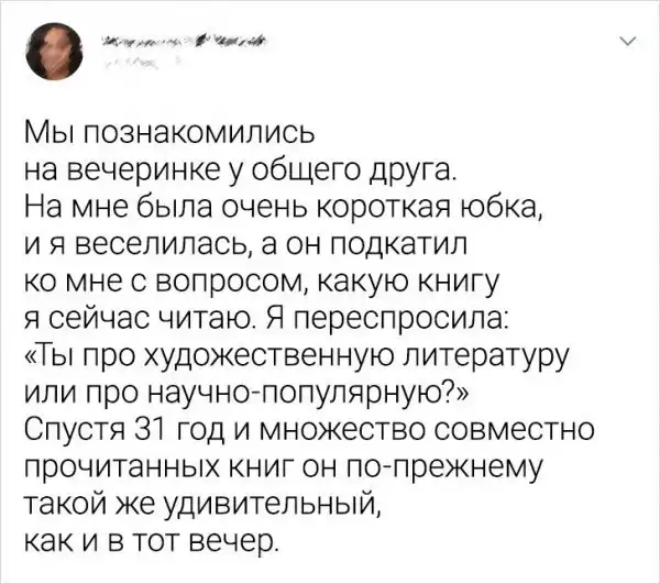 Когда вы появляетесь со своей второй половинкой в новой компании, то обязательно про звучит вопрос: "о, расскажите, как вы познакомились". У каждой пары есть своя история и многие из них весьма забавны. Собственно, именно этому и посвящен этот маленький тред в Твиттере.