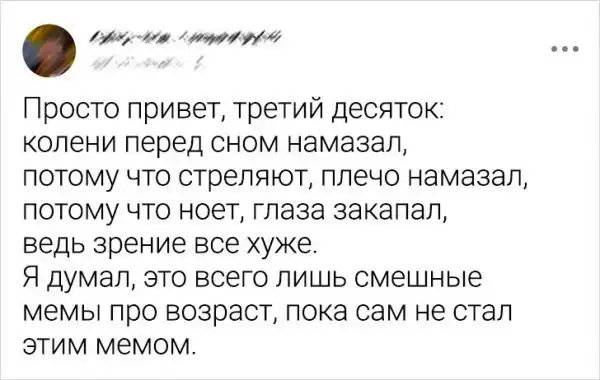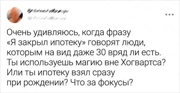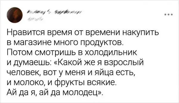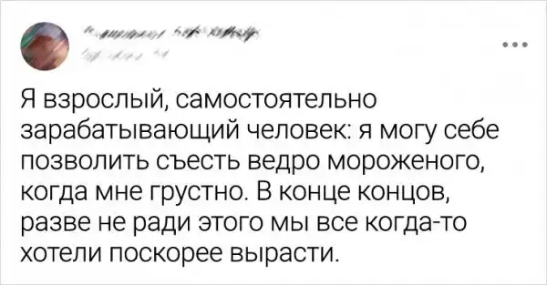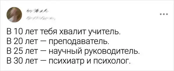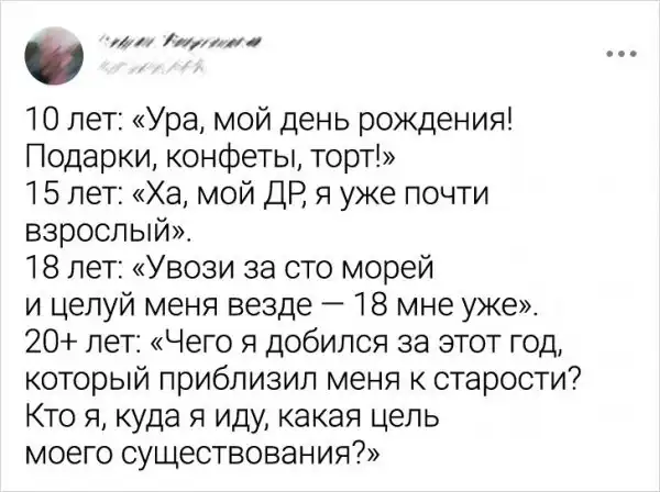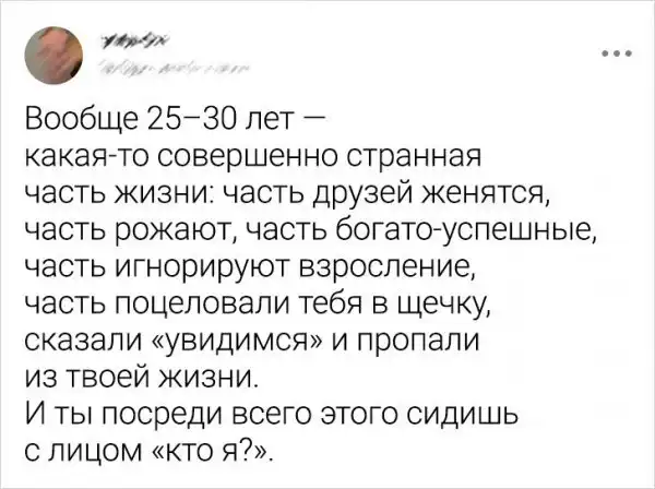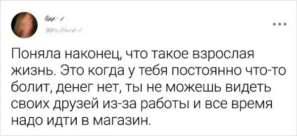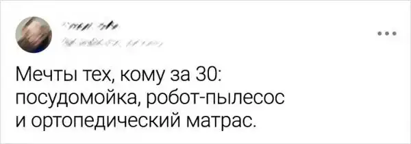 Согласитесь, что когда нам было 18-19 лет, казалось, что мы практически бессмертны. Мол, до 30 лет еще жить и жить. Следовательно, мы успеем и погулять и добиться всех взрослых целей, которые надо успеть выполнить к "тридцатке". Например, сделать карьеру, заработать приличное количество денег, купить машину, обзавестись хорошим жильем, и, конечно же женить и завести детей. Но, в реальной жизни, далеко не всем удается выполнить хотя бы несколько из этих пунктов к 30 годам. Например, авторам этих твитов не удалось. Но они не отчаиваются, ведь они добились других "прелестей" взрослой жизни.