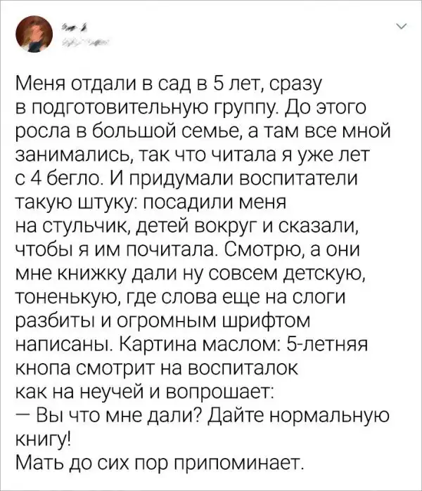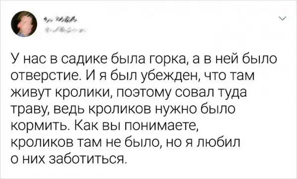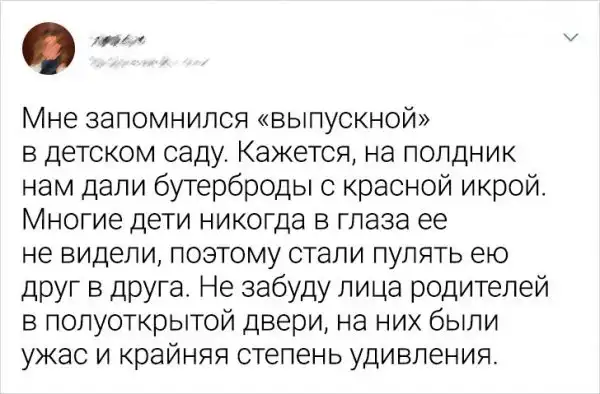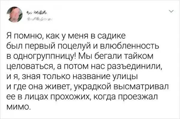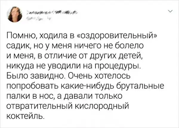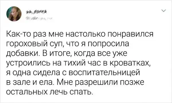 В Твиттере любят не только прикалываться, но и вспоминать старые добрые деньки. Поэтому пользователи то и дело устраивают ностальгические треды на разные темы. В этот раз народ решил поделиться воспоминаниями о детском садике. Наверняка и у вас есть пара забавных историй из того счастливого времени.