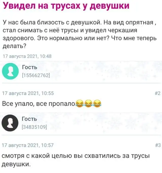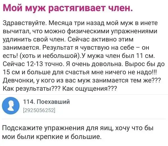 Срамота, да и только. Что еще можно сказать об этих безумных форумах для женщин? Но это одно из немногих мест, где дамы могут утолить свое любопытство и поговорить на интимные темы. Но лучше бы они обратились к психотерапевту.