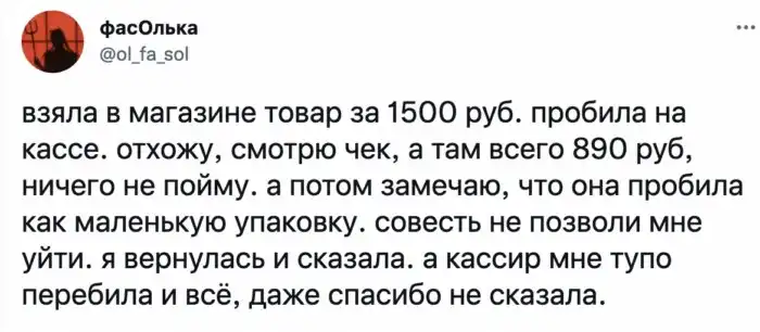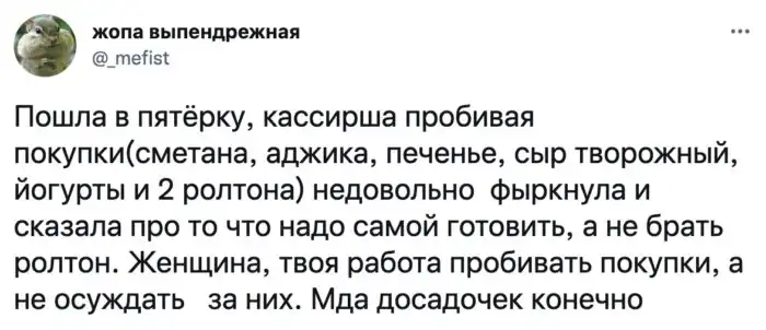 Не во всех магазинах есть кассы самообслуживания, поэтому исключить покупку без услуг человека возможно не везде. В нашей подборке герои столкнулись с бестактными кассирами, которые влезли в чужие дела и дали непрошеный совет.