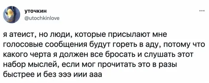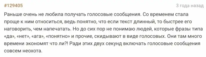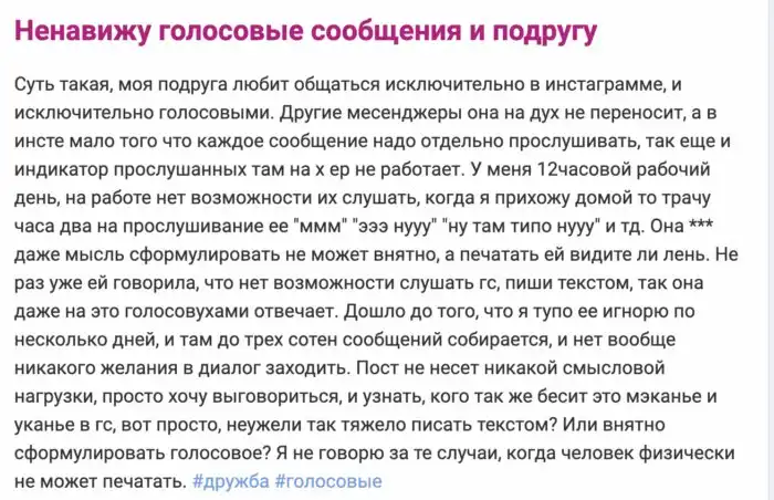Кто-то считает, что голосовые сообщения значительно упрощают жизнь, особенно когда едешь за рулем. Другие предпочитают текст. Сегодня мы собрали мнения людей, которые терпеть не могут голосовые, а также истории, связанные с этим.