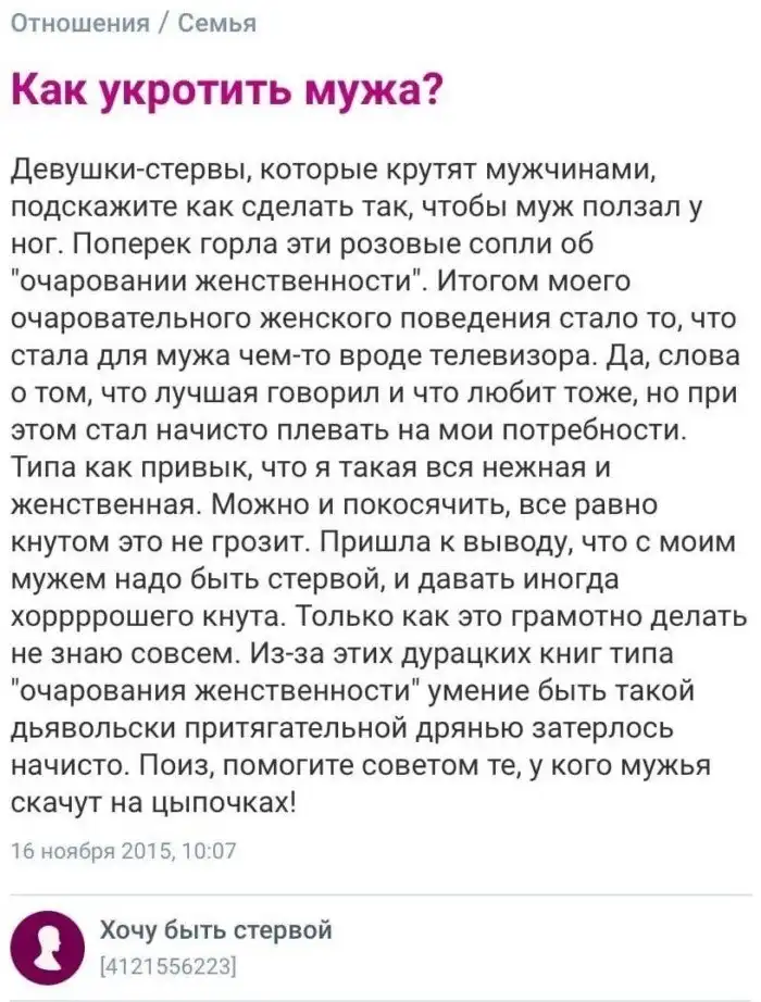 Женское сообщество полно чудных дам. На форумах леди обсуждают со всей серьезностью такое, что легко принять за шутку. Но тут не место иронии, только важные вопросы, обсуждение реальных ситуаций!