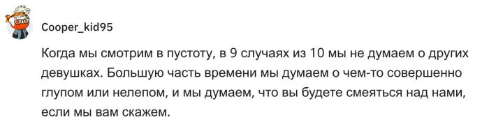 9. В основном парни не думают ни о чём либо рассуждают о глобальном