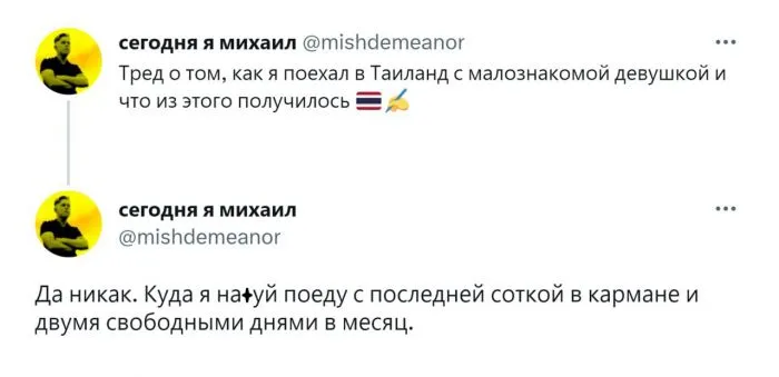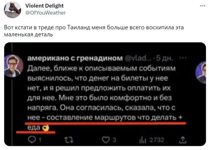 Пользователь Твиттера рассказал историю своего отдыха в Таиланде, на который он отправился с незнакомой девушкой. Симпатия меж ними была, и парень предвкушал отличный отпуск с симпатичной попутчицей. Он заплатил за её билеты и надеялся на взаимность, однако что-то пошло не так...