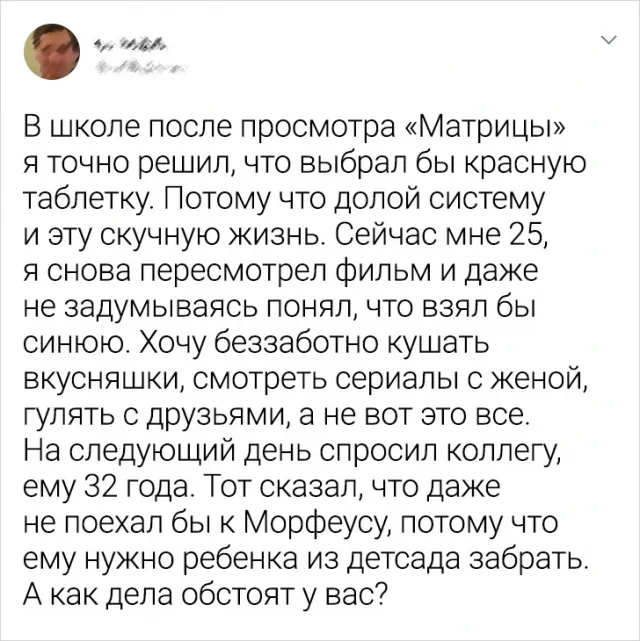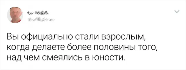 Взросление, как правило, наступает внезапно, как гром среди ясного неба. Вдруг начинаешь замечать, что на кассах магазинов уже не спрашивают паспорт. Обращение "молодой человек" адресуется не вам, а на каких-нибудь тусовках, окружающие думают, что за кем-то "пришел отец". Что же делать? Правильно, расслабиться и получать удовольствие. Че уж там говориться, Маколею Калкину уже 42! Поэтому к возрасту надо относиться со здоровой долей юмора и не переживать.