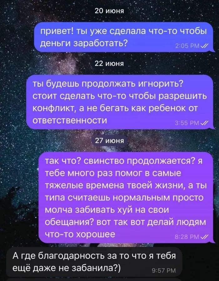 Девушка заняла у парня 400 лари (чуть больше 13к рублей), ответ на просьбу о возврате, с ее стороны, убил …