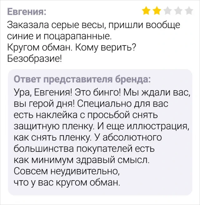 Отзывы уже давно стали самостоятельным комедийным поджанром в Сети. Их остроумные авторы далеко не всегда дают четкую информацию о товаре, но читать их комменты всегда весело. Но и сами продавцы от них не отстают и порой дают очень смешные и колкие ответы. Давайте поднимем себе настроение и поглядим новую подборку отзывов с просторов Сети.