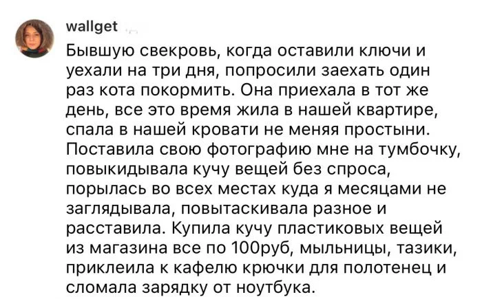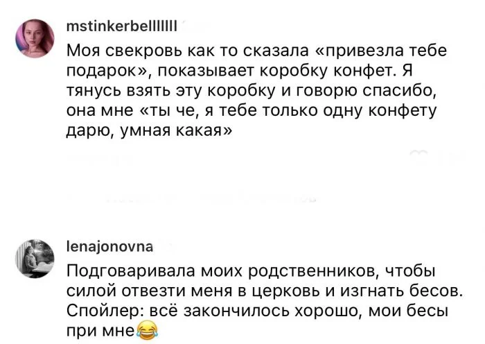Когда девушки выходят замуж, впридачу к мужу они получают свекровь. Отношения с мамами мужчин не всегда складываются удачно, особенно когда те ревностно относятся к появлению у сыновей новой семьи. Девушки рассказали о выходках свекровей, от которых глаза лезут на лоб.