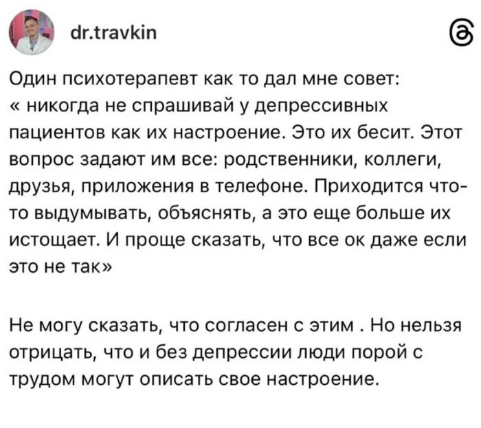 Доктор Травкин - врач-психотерапевт, психиатр. Он не только ведёт консультации, но и делится своим мнением и историями в соцсетях. Давайте посмотрим, о чём рассуждает действующий врач-мужчина?