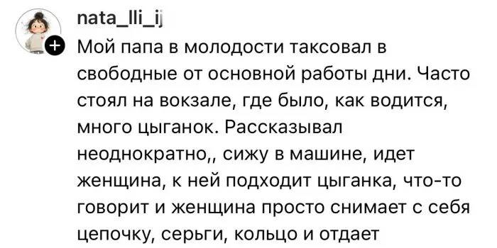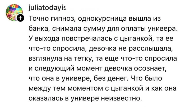 Говорят, что цыганки умеют гипнотизировать. Они умудряются выдернуть из толпы людей, которые легко поддаются обработке и как в тумане снимают с себя золотые украшения. В этом посте герои поделились своими историями, в которые с трудом можно поверить.
