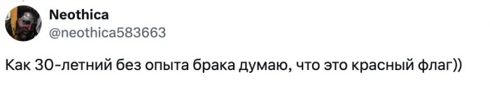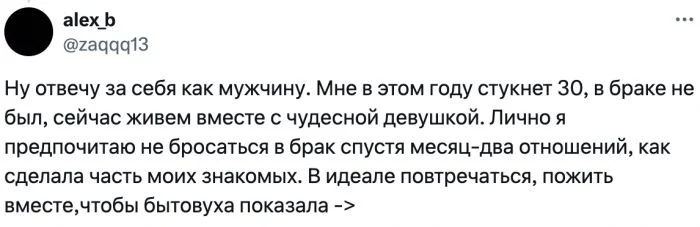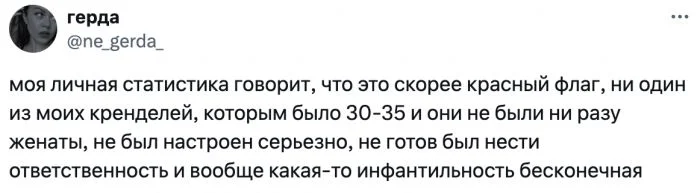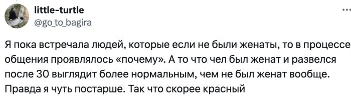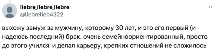 Девушки в Твиттере рассуждают на важную тему. Сейчас многие 25-летние задумываются о том, с кем строить отношения - и хорошо ли, когда будущий избранник никогда не был женат. Мнения на этот счёт собраны в посте.