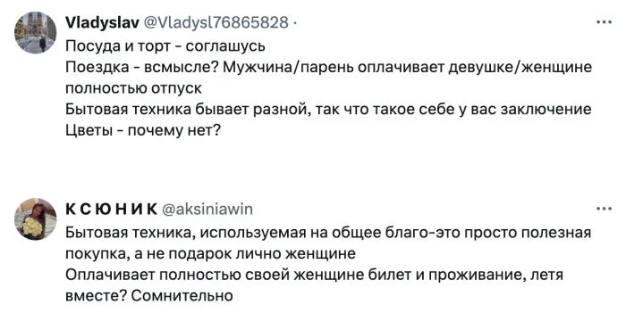 Ксения в Твиттере поделилась своим мнением о том, что для женщины - подарок, а что нет. В комментариях бурно начали обсуждать эту тему. В чём девушка не права?