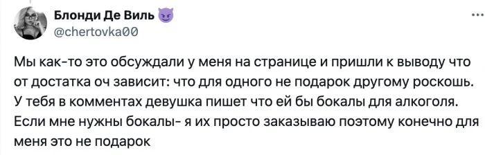 6. Уровень дохода - разный, в комментариях ещё привели в пример отношения с родителями, когда они не могли купить базовую одежду ребёнку и называли любую покупку необходимы вещей подарков