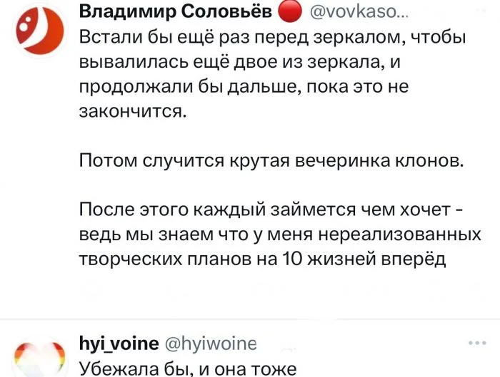 Пользовательница Марта задала комментаторам вопрос: что бы они сделали, если бы встретили своего двойника. Который точная копия, с теми же воспоминаниями и набором качеств. Он бы вышел из зеркала - и всё. Реакции людей такие предсказуемые!