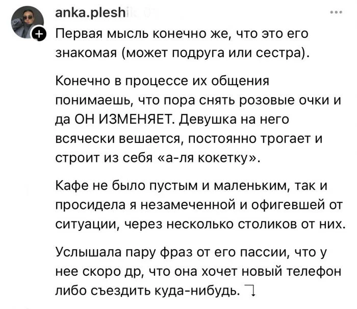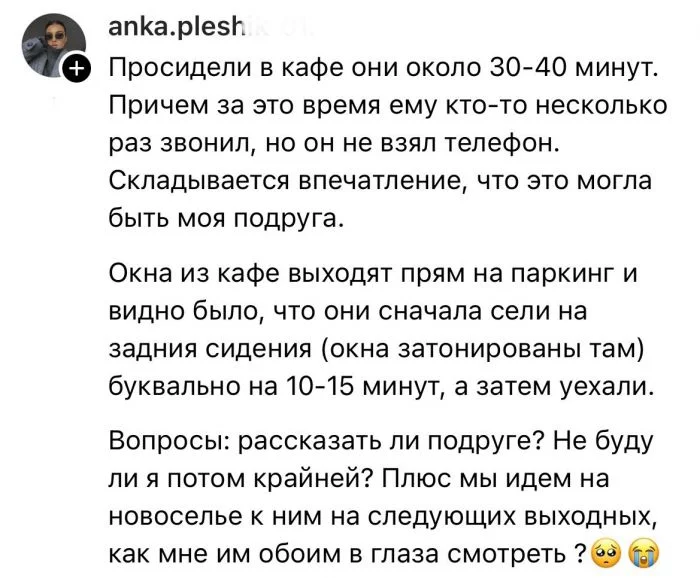 "Мы встретились с ней в кафе возле ее дома. Я подробно рассказала ситуацию, как увидела ее парня в кафе с другой, также объяснила - почему не смогла рассказать сразу. Она была в шоке, но оказывается, что предпосылки уже были: он часто разговаривал по телефону в ванной под шум воды, постоянно менял пароли в телефоне, вышел с телеграмма на домашнем компе, часто уезжал в свой выходной в город (якобы по делам) и т.д. С ним она поговорила. Был жуткий скандал. Он обвинял меня во всех смертных грехах и пытался отвертеться. Сейчас она живет у сестры. Планирует съезжать от него и искать квартиру".